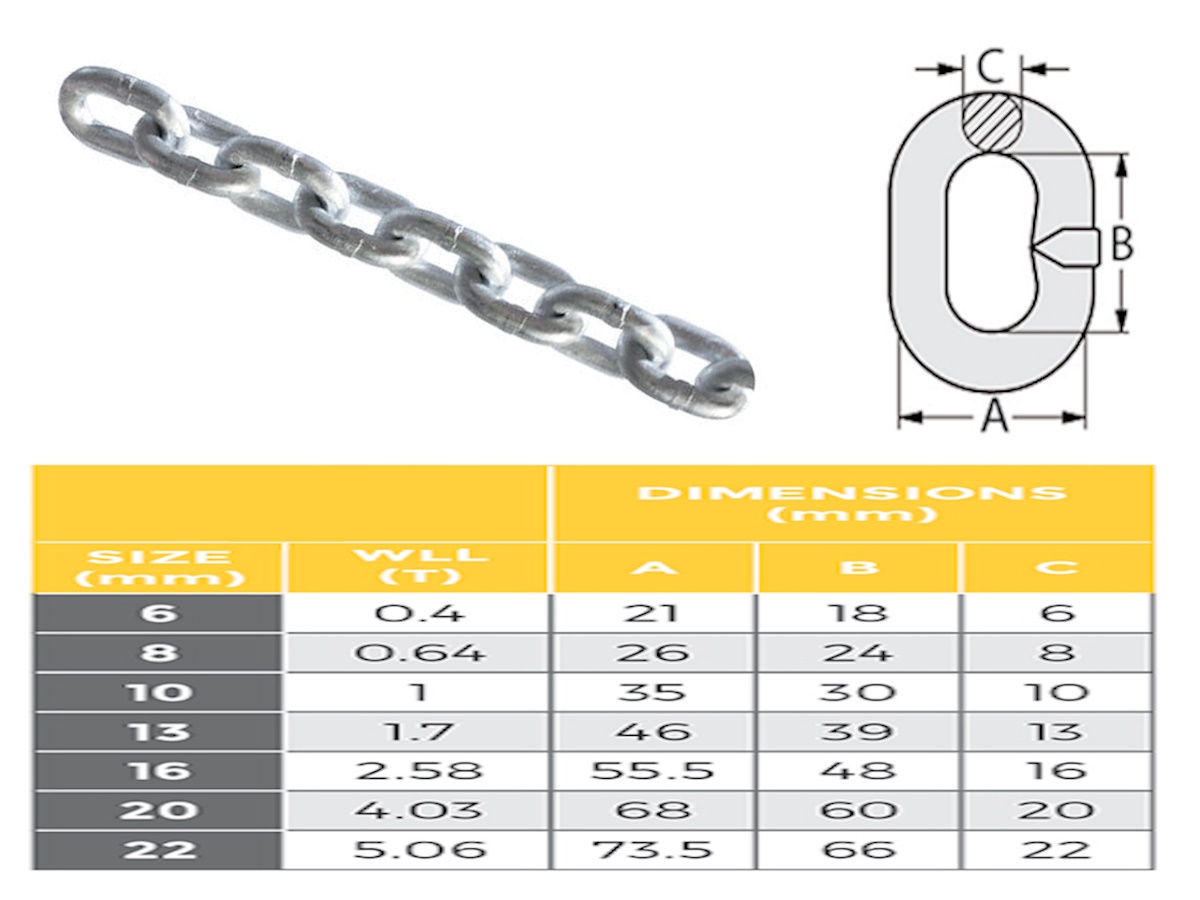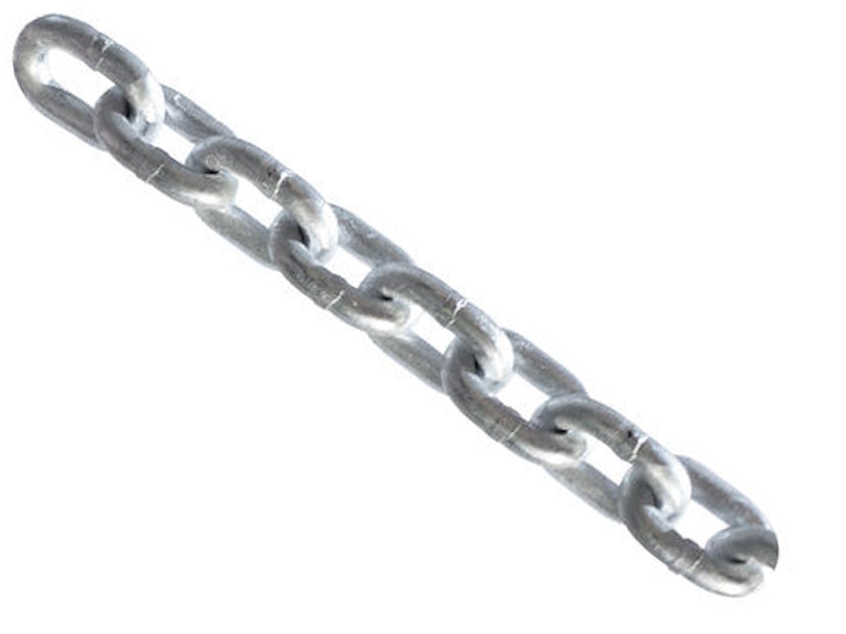 6.0mm Galvanised Steel Chain is the heavy general purpose rated chain. This chain suits rigging and Construction. The G30 (L) Grade is calibrated chain used generally used in marine or vertical hanging support applications.