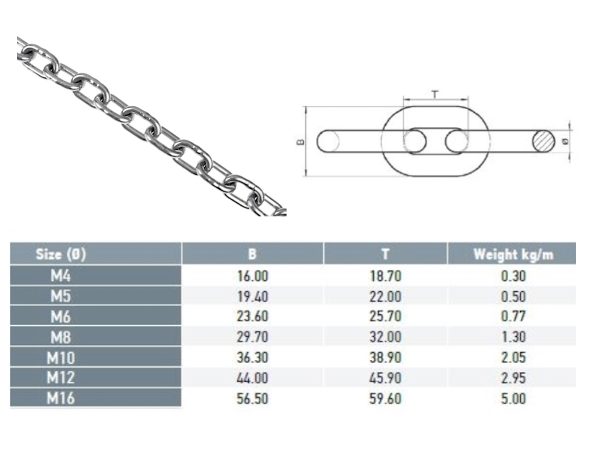 Medium Link G304 Stainless Steel Chain is the lighter general purpose chain. This chain suits light rigging and Shop Fitting.